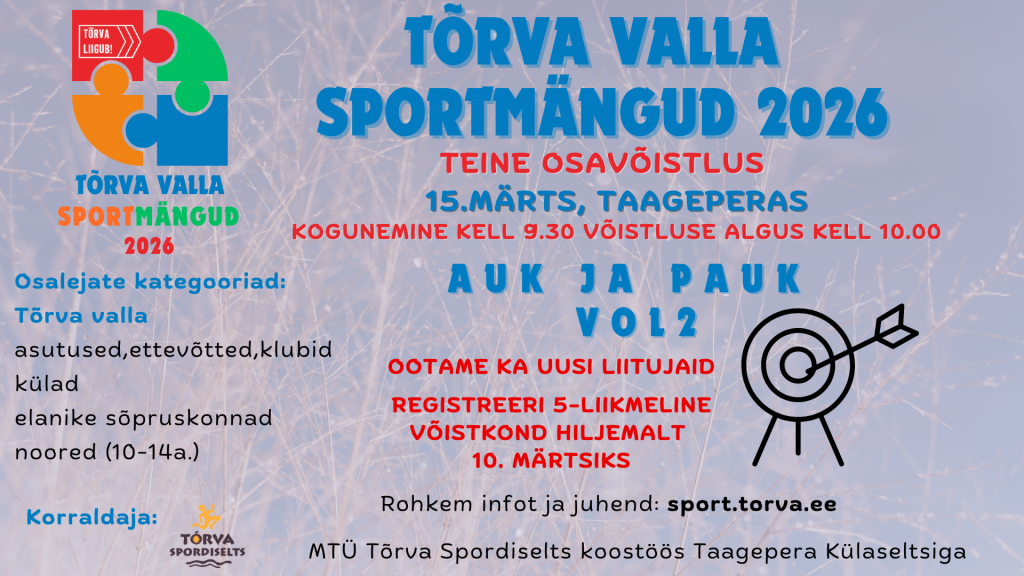 Meeskonna osalus tuleb kinnitada hiljemalt 10.02.2026 https://forms.gle/dWqUb1eBsUCu3Rz3A või korraldaja e-postil tiina.neumann@torva.ee